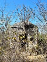 Plantation smokehouse with ships etched on interior walls, pyramidal stone roof plastered with lime. Windows slant inwards.