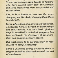 In the twenty-second century Earth obtains limitless, free energy from a source science little understands: an exchange between Earth and a parallel universe, using a process devised by the aliens. But even free energy has a price. The transference process itself will eventually lead to the destruction of the Earth's Sun--and of Earth itself.