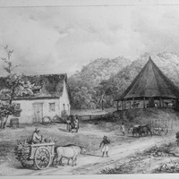 Sketch of mule-powered mill (R) in elevated position from boiling house (L) on St. Clair farm, Trinidad. Cane in route to be crushed in mill depicted in cart in foreground.