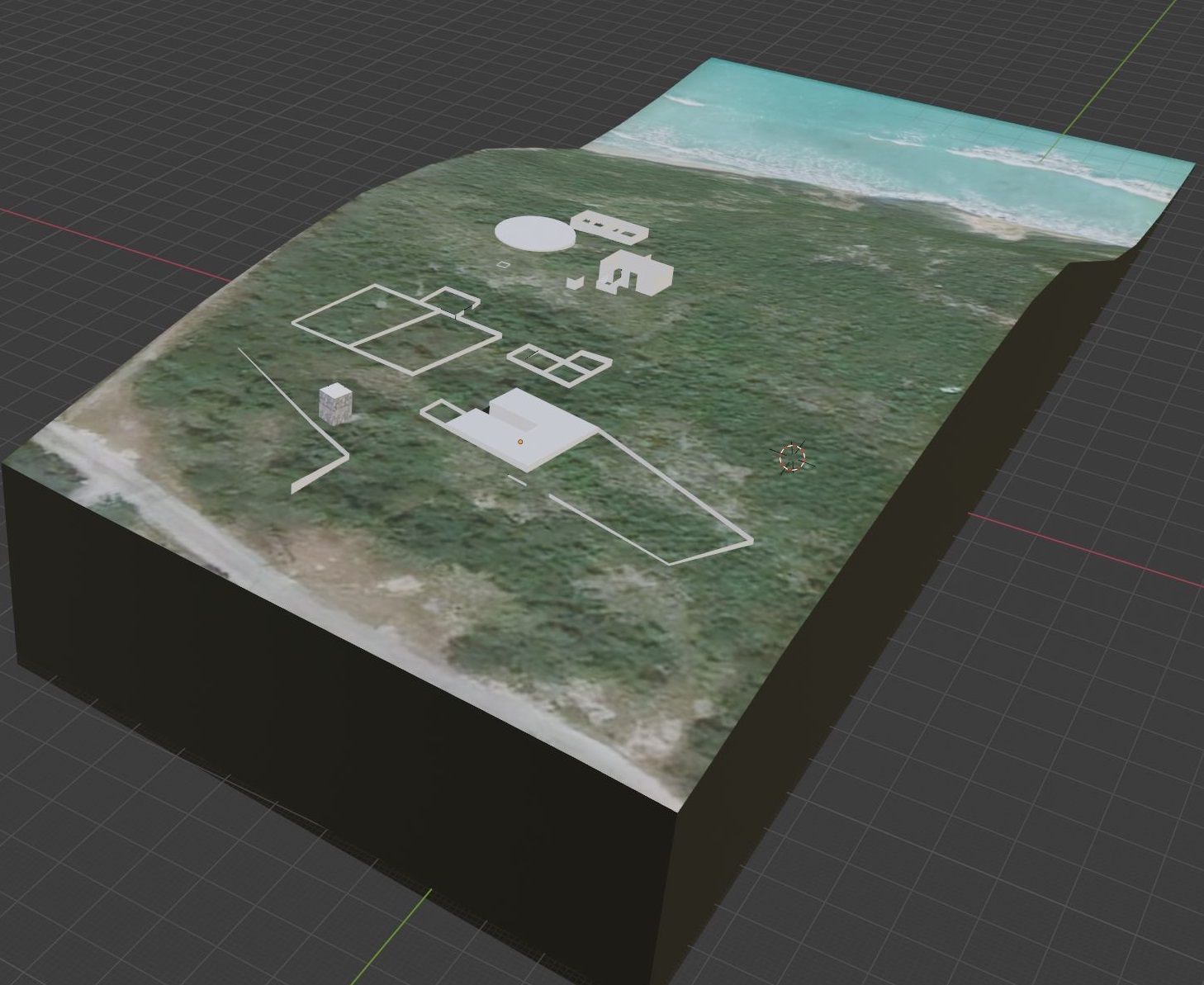 3D map of site historic structures over topographic data built in Blender with GIS plugin.