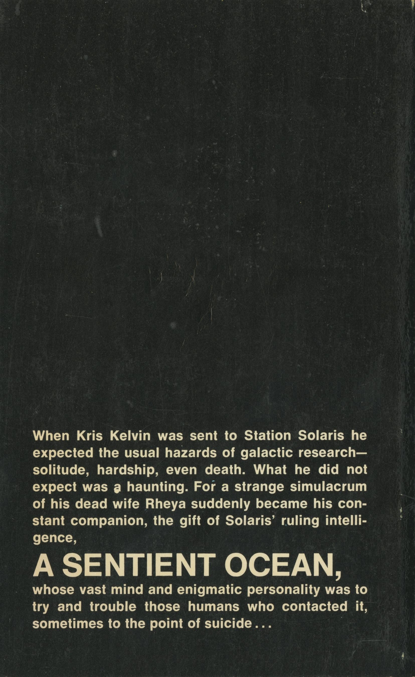 When Kris Kelvin was sent to Station Solaris he expected the usual hazards of galactic research-solitude, hardship, even death. What he did not expect was a haunting. For a strange simulacrum of his dead wife Rheya suddenly became his constant companion, the gift of Solaris' ruling intelligence, A SENTIENT OCEAN, whose vast mind and enigmatic personality was to try and trouble those humans who contacted it, sometimes to the point of suicide...