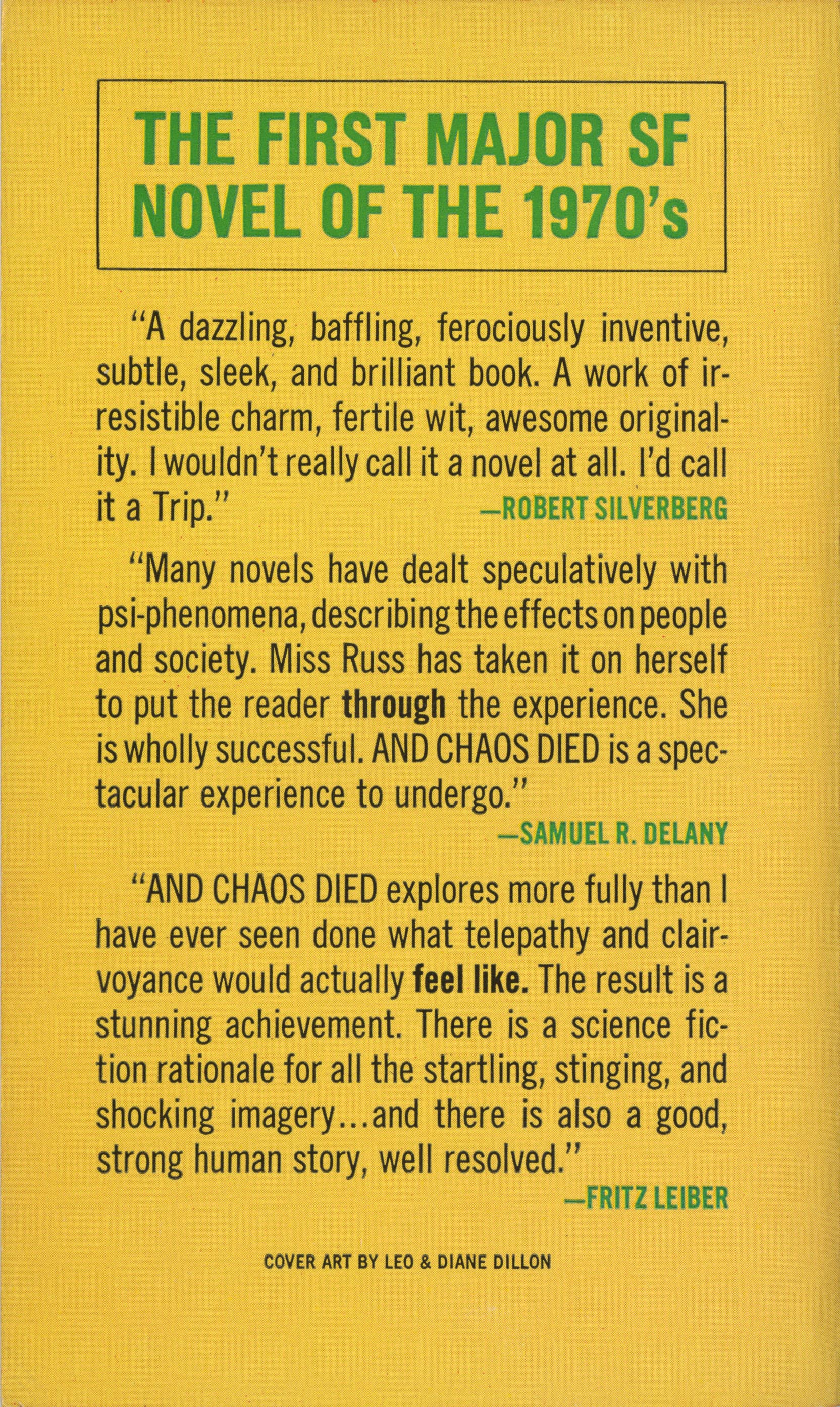 This Nebula Award-nominated "work of awesome originality" (Robert Silverberg) is a mind-blowing exploration of telepathy and power on an Earth-like planet. Earthman Jai Vedh was on a star voyage when his ship blew up, leaving him stranded on an uncharted Earth-like planet. In this strange new land, he's amazed to discover a colony of humans who lost contact with their home world centuries before. They've developed telepathy, telekinesis, and teleportation-and structured a sophisticated social system out of these abilities. Under the tutelage of a female mentor named Evne, Jai Vedh begins to develop his own mental powers. But when an unexpected rescue arrives, the Earth he returns to is nothing like he remembered ... Wildly imaginative, wholly original, and boldly experimental in form, And Chaos Died "is a spectacular experience to undergo" (Samuel R. Delany).