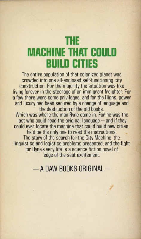 The entire population of that colonized planet was crowded into one all-enclosed self-functioning city construction. For the majority the situation was like living forever in the steerage of an immigrant freighter. For a few there were some privileges, and for the Highs, power and luxury had been secured by a change of language and the destruction of the old books. Which was where the man Ryne came in. For he was the last who could read the original language - and if they could ever locate the machine that could build new cities, he'd be the only one to read the instructions. The story of the search for the City Machines, the linguistics and logistics problems presented, and the fight for Ryne's very life is a science fiction novel of edge-of-the-seat excitement.