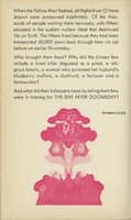 When the Yellow Alert flashed, all flights from O'Hare Jetport were postponed indefinitely. Of the thousands of people waiting there nervously, only fifteen escaped in the sudden nuclear blast that destroyed life on Earth. The fifteen lived because they had been transported 50,000 years back through time -- to just before an earlier Doomsday. Who brought them there? Why did the chosen few include a hired killer disguised as a priest, a religious fanatic, a woman who poisoned her husband's blueberry muffins, a slumlord, a lecturer, and a farm worker? And what did their kidnappers mean by telling them they were in training for THE DAY AFTER DOOMSDAY?