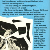 The Druggish were much better at their job than all the king's horses had been with Humpty Dumpty. First, the Druggish simply disassembled Edward Berner--tissue by tissue, nerve by nerve. In tanks they stored the million remnants and shreds that had been Berner, and they changed his brain into a fantastic recording device. Then they simply put him back together. Sinew by sinew, cell by cell. But it was not the same Edi Berner. The new Ed Berner was stronger, healthier--stronger and healthier than any other man. And with a sexual appetite and a promised life-span greater than anyone on earth. He was very nearly invincible. Very nearly. Unfortunately, there was a deadly flaw. The Druggish had forgotten to make the new Ed Berner a wiser one.