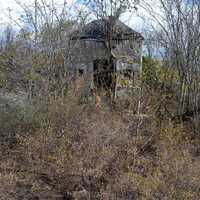 Plantation smokehouse with ships etched on interior walls, pyramidal stone roof plastered with lime. Windows slant inwards.