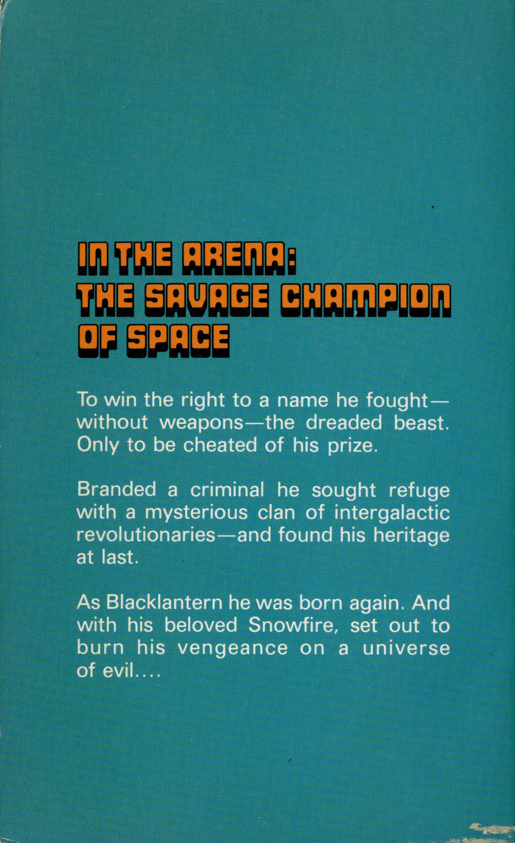On the arena: the savage champion of space.To win the right to a name he fought - without weapons - the dreaded beast. Only to be cheated of his prize. Branded a criminal he sought refuge with a mysterious clan of intergalactic revolutionaries - and found his heritage at last. As Blacklantern he was born again. And with his beloved Snowfire, set out to burn his vengeance on a universe of evil.