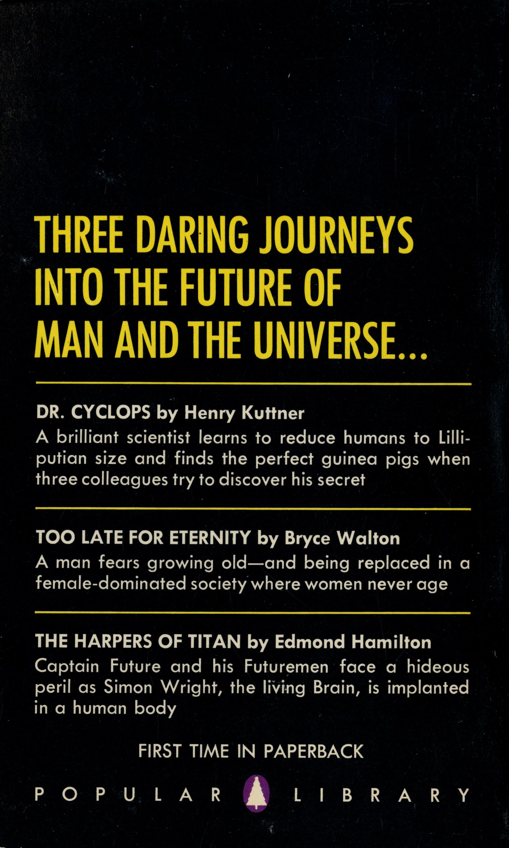 Henry Kuttner, including Too late for eternity, by Bryce Walton, and the Harpers of Titan, by Edmond Hamilton