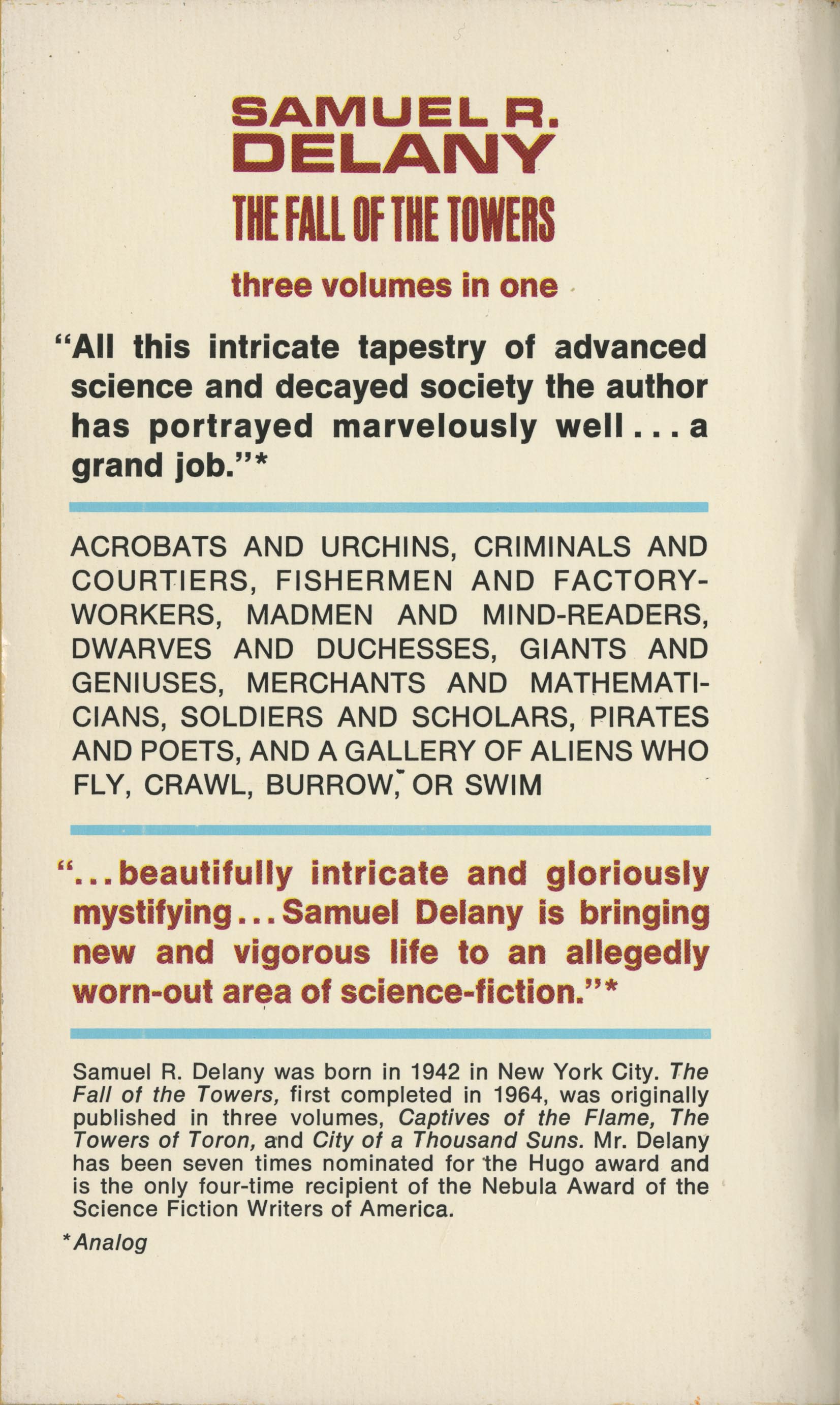 Samuel R. Delany's novel in three parts reflects the society of a future Earth through the eyes of colorful characters.