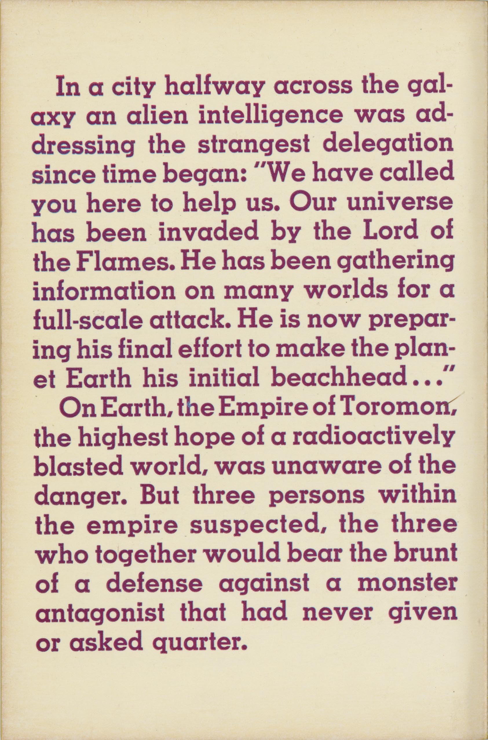 1500 years in the future Earth, recovering from a nuclear holocaust, is ruled by the empire of Toromon, and is engaged in a bizarre interstellar war in which soldiers are wired into a computer and teleported to battle. The teleportation, however, is false: the soldiers experience battle and survivors remember the deaths of their comrades, but in fact this is computer generated. All remain in their "coffins" and the dead are incinerated.