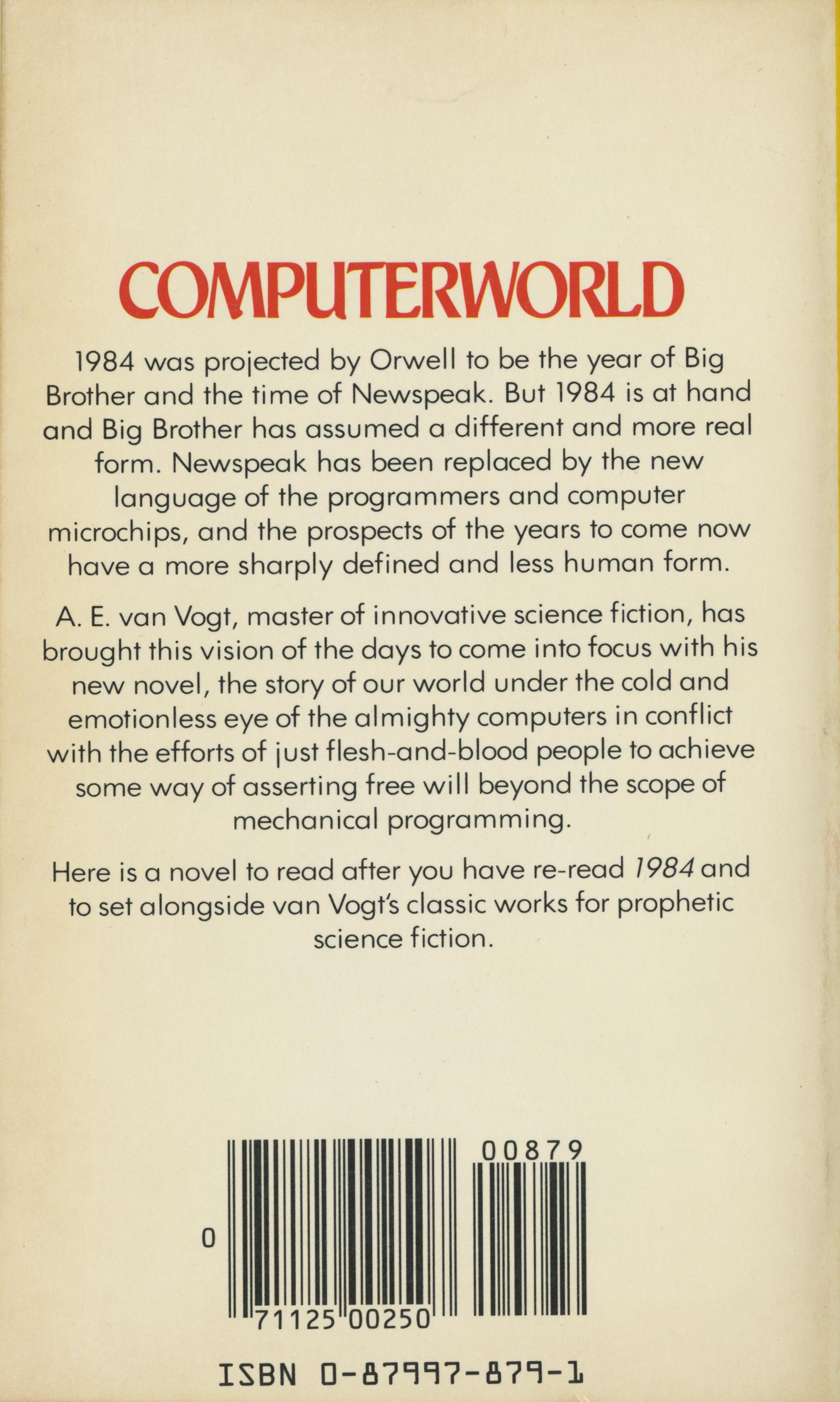 1984 was projected by Orwell to be the year of Big Brother and the time of Newspeak. But 1984 is at hand and Big Brother has assumed a different and more real form. Newspeak has been replaced by the new language of the programmers and computer microchips, and the prospects of the years to come now have a more sharply defined and less human form. Van Vogt, master of the innovative science fiction, has brought this vision of the days to come into focus with his new novel, the story of our world under the cold and emotionless eye of the almighty computers in conflict with the efforts of just flesh-and-blood people to achieve some way of asserting free will beyond the scope of mechanical programming.