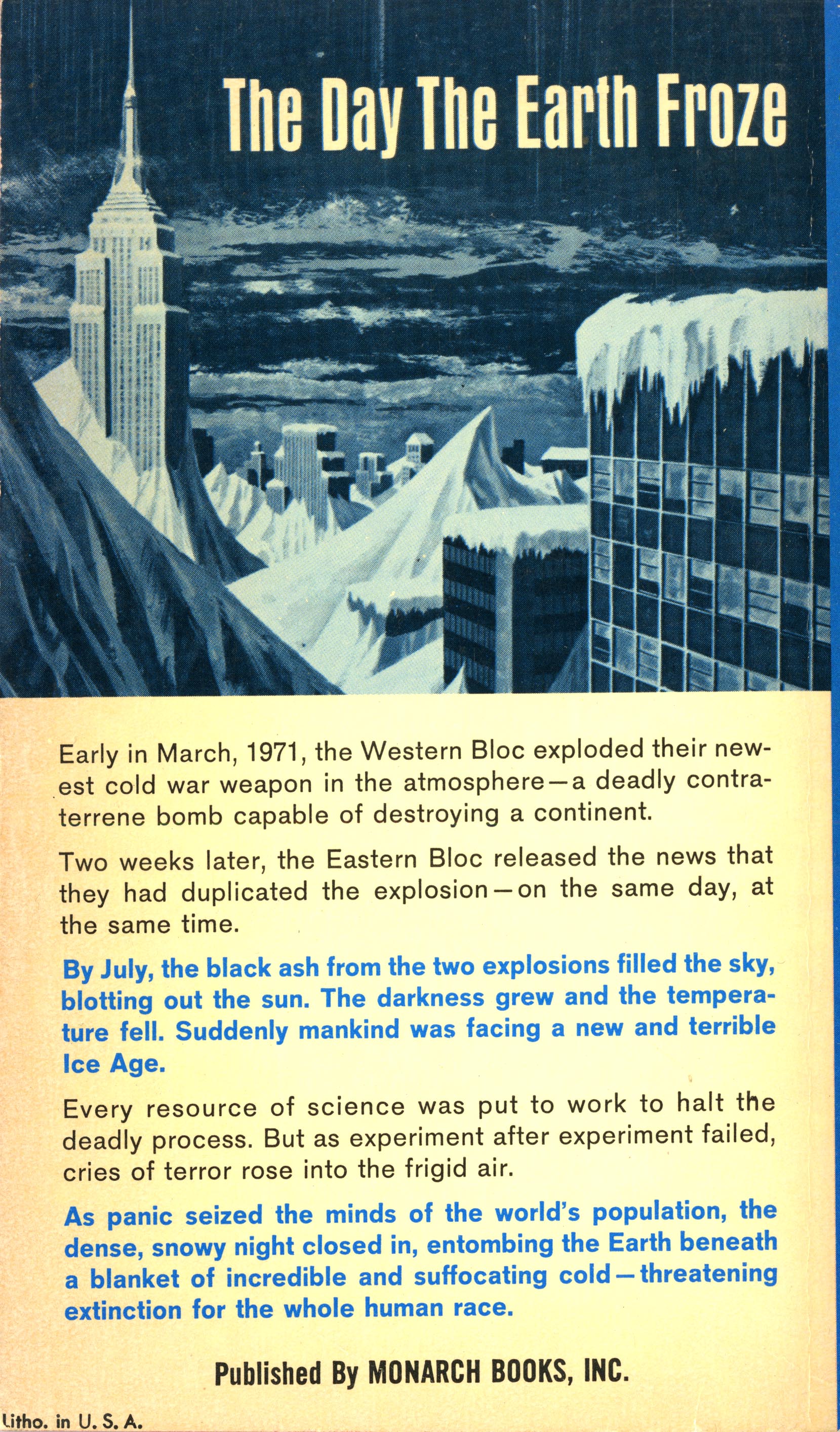 Early in March, 1971, the Western Block exploded their newest Cold War weapon in the atmosphere-a deadly contraterrene bomb capable of destroying a continent. Two weeks later, the Eastern Bloc realized the news that they had duplicated the explosion-on the same day, at the same time. By July, the black ash from the two explosions filled the sky, blotting out the sun. The darkness grew and the temperature fell. Suddenly mankind was facing a new and terrible Ice Age.