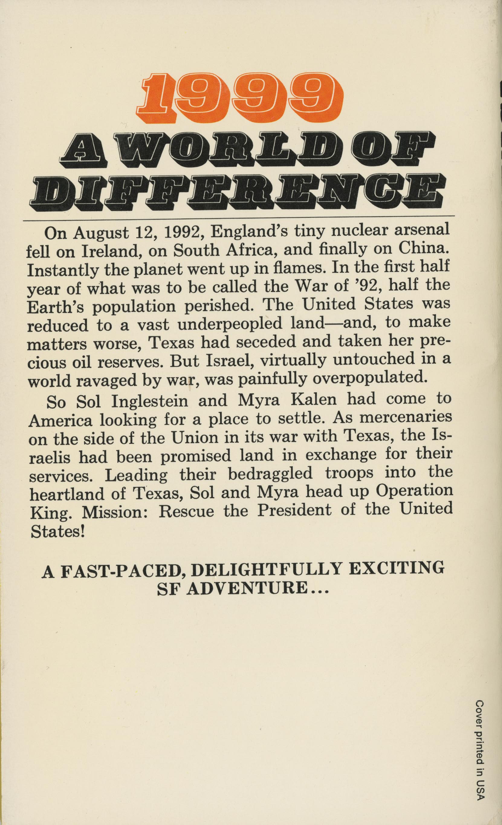 On August 12, 1992, England's tiny nuclear arsenal fell on Ireland, on South Africa, and finally on China. Instantly, the planet went up in flames. In the first half year of what was to be the War of '92, half the Earth's population perished. The United States was reduced to a vast under peopled land-and, to make matters worse, Texas had seceded and taken her precious oil reserves. But Israel, virtually untouched in a world ravaged by war, was painfully overpopulated. So Sol Iglestein and Myra Kalen had come to America looking for a place to settle. As mercenaries on the side of the Union in its war with Texas, the Israelis had been promised land in exchange for their services. Leading their begraggled troops into the heartland of Texas, Sol and Myra head up Operation King. Mission: Rescue the President of the United States!